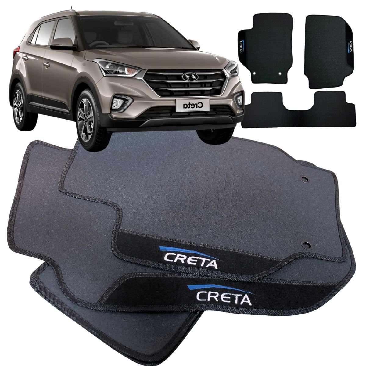 Tapete Creta, tapete borracha, tapete automotivo, tapete emborrachado, jogo de tapetes, acessórios para carro, tapete sob medida, tapete antideslizante, tapete premium, protetor interno Creta, tapete resistente, tapete com bordado, tapete para Creta.